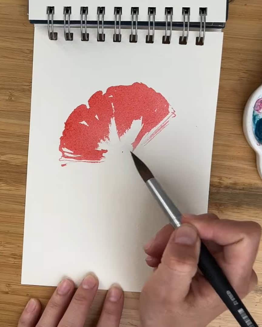 The artist uses a permanent red that’s very creamy and grabs a relatively big brush. The brush is soaked in the red mix and held parallel to the paper.
