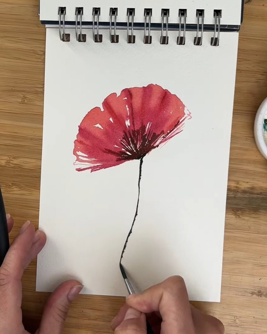 Using the tip of the brush, tiny spikes are added around the stem to mimic the poppy’s natural texture.