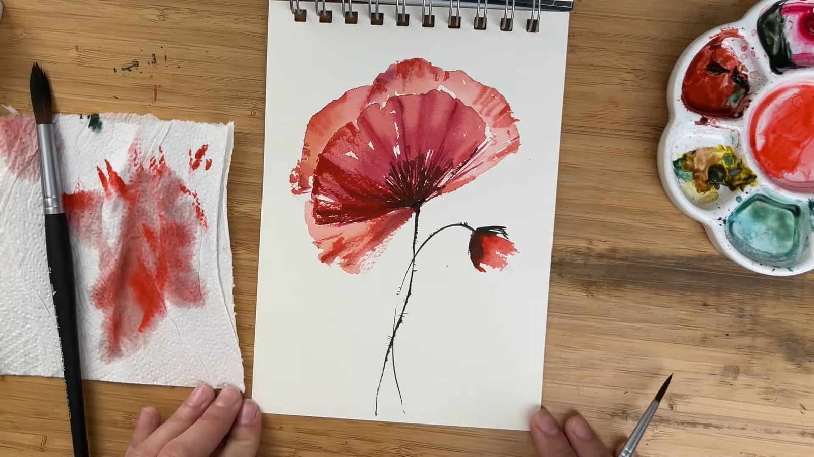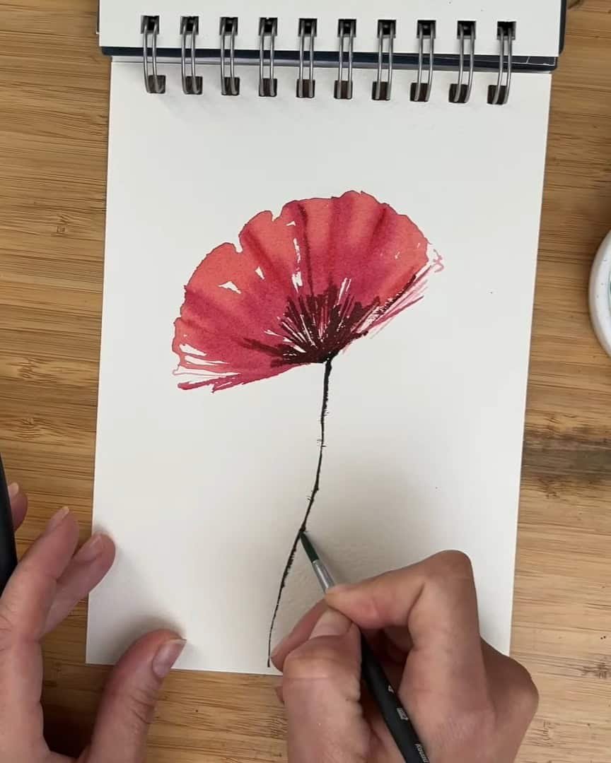 While the petals dry, the artist mixes greens and adds a typical poppy bud with just a few simple brush strokes.