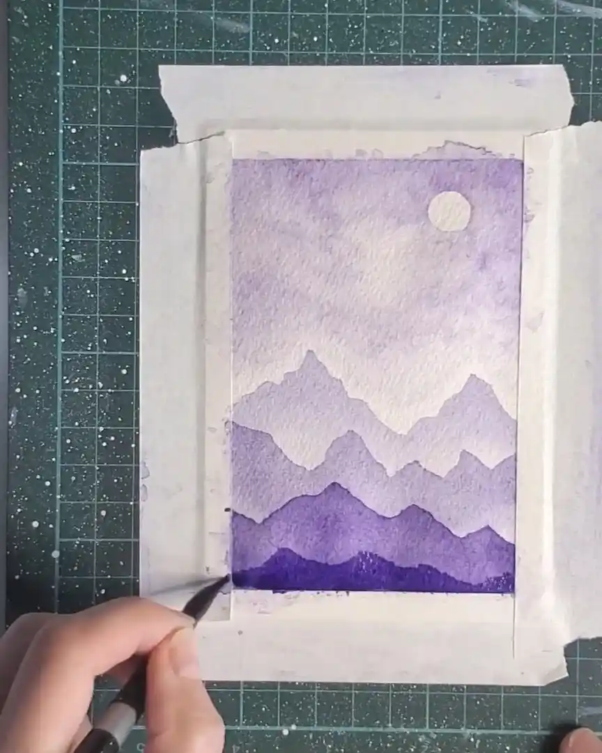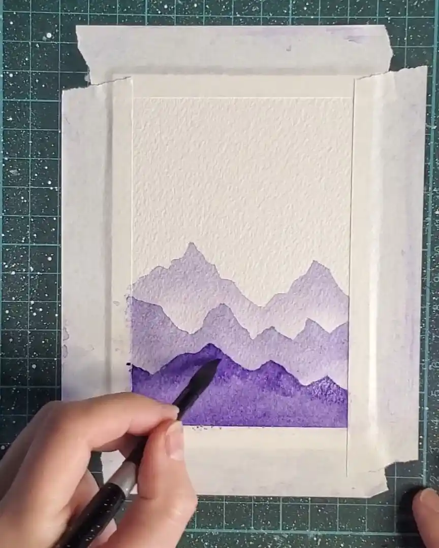 The mountain peaks are drawn, then the entire shape is filled with the deep violet tone.