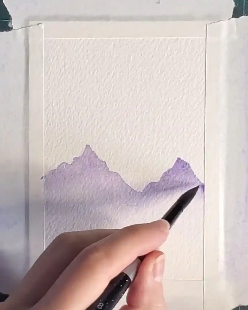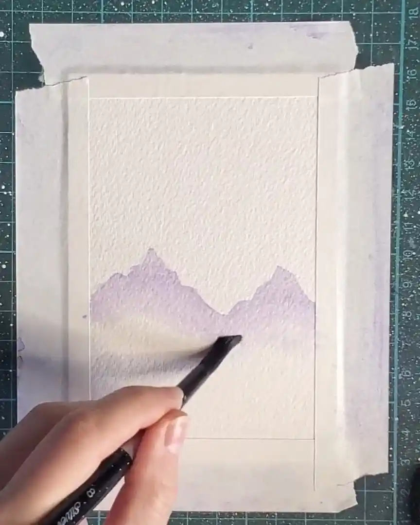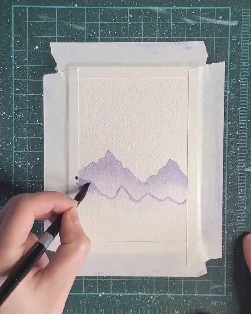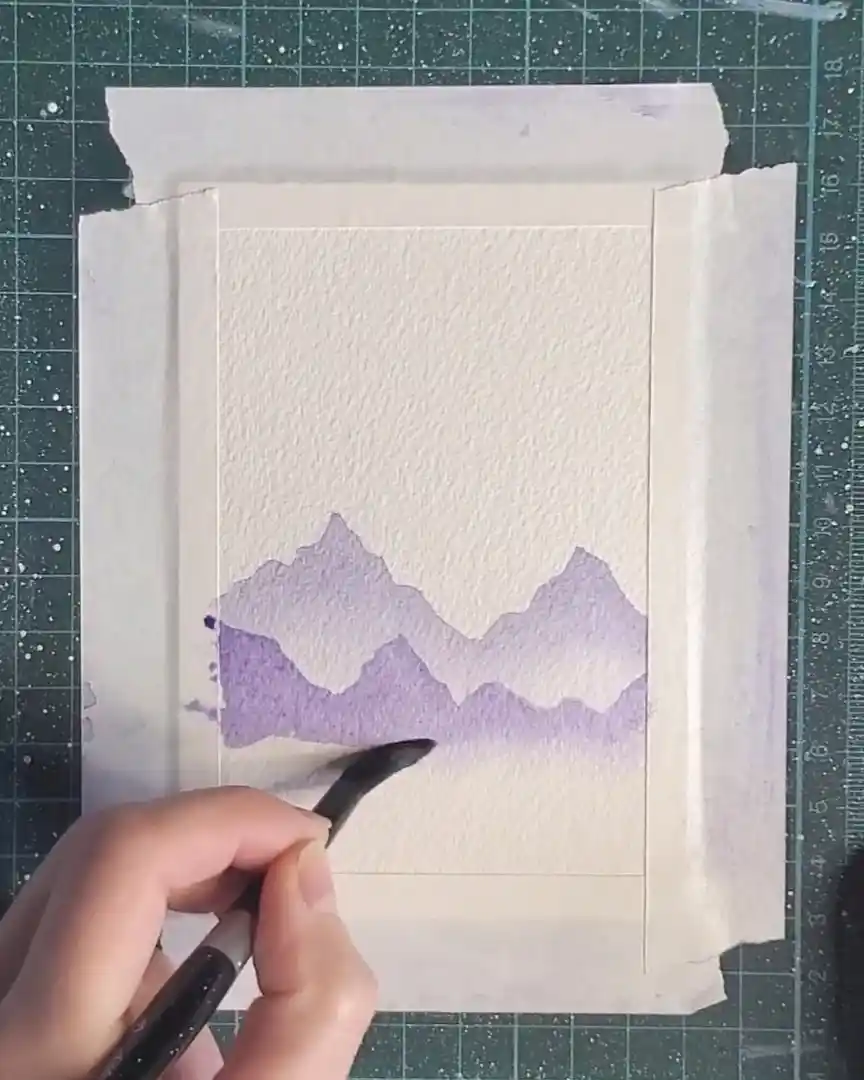 Once the shapes are filled, a clean, damp brush is used to softly blend the bottom edges, keeping the misty, atmospheric appearance.