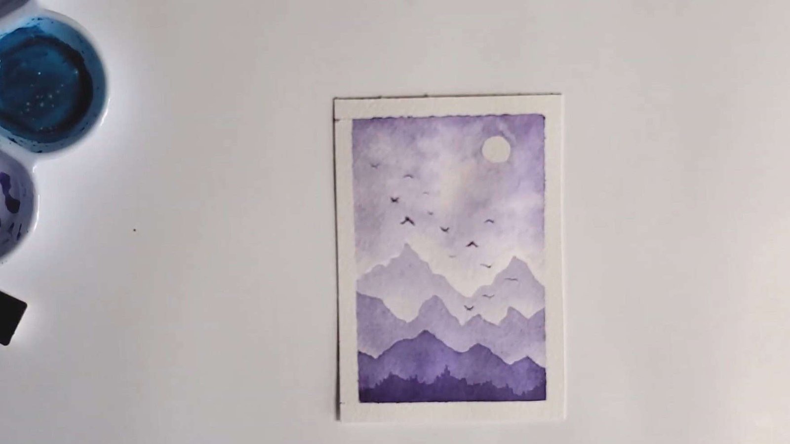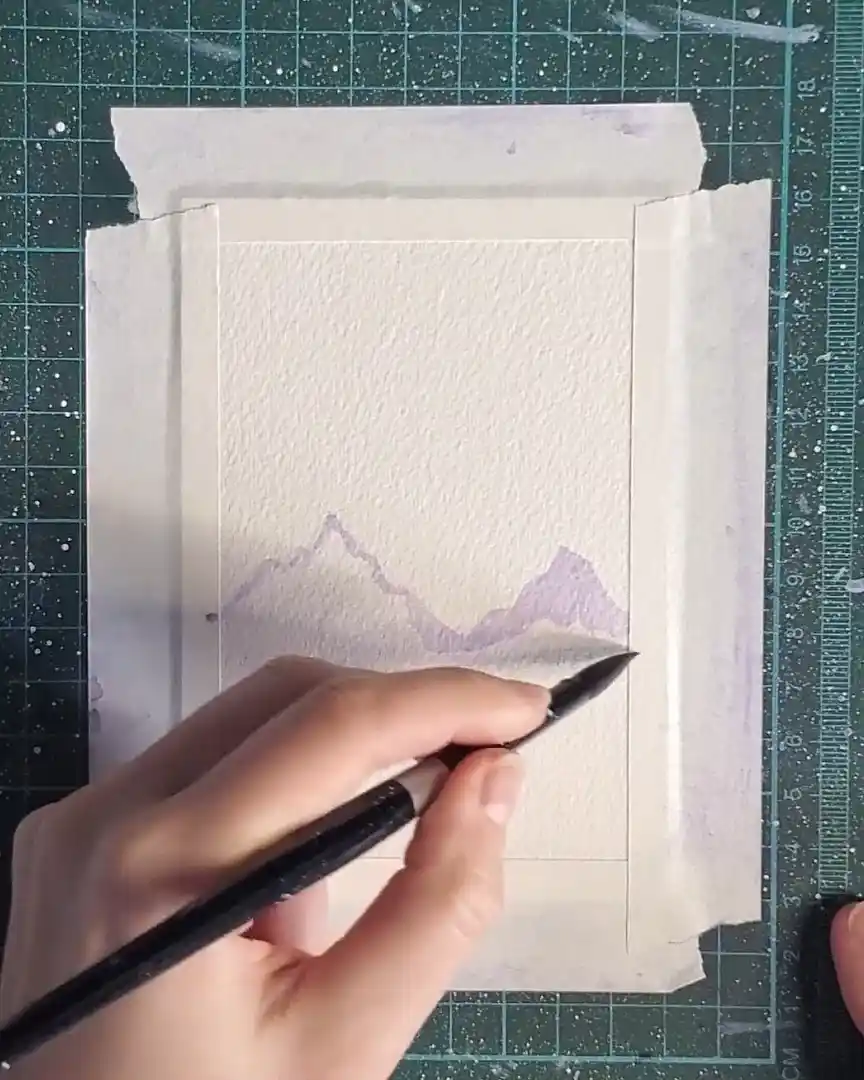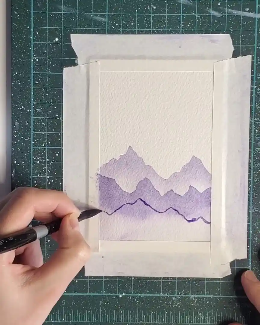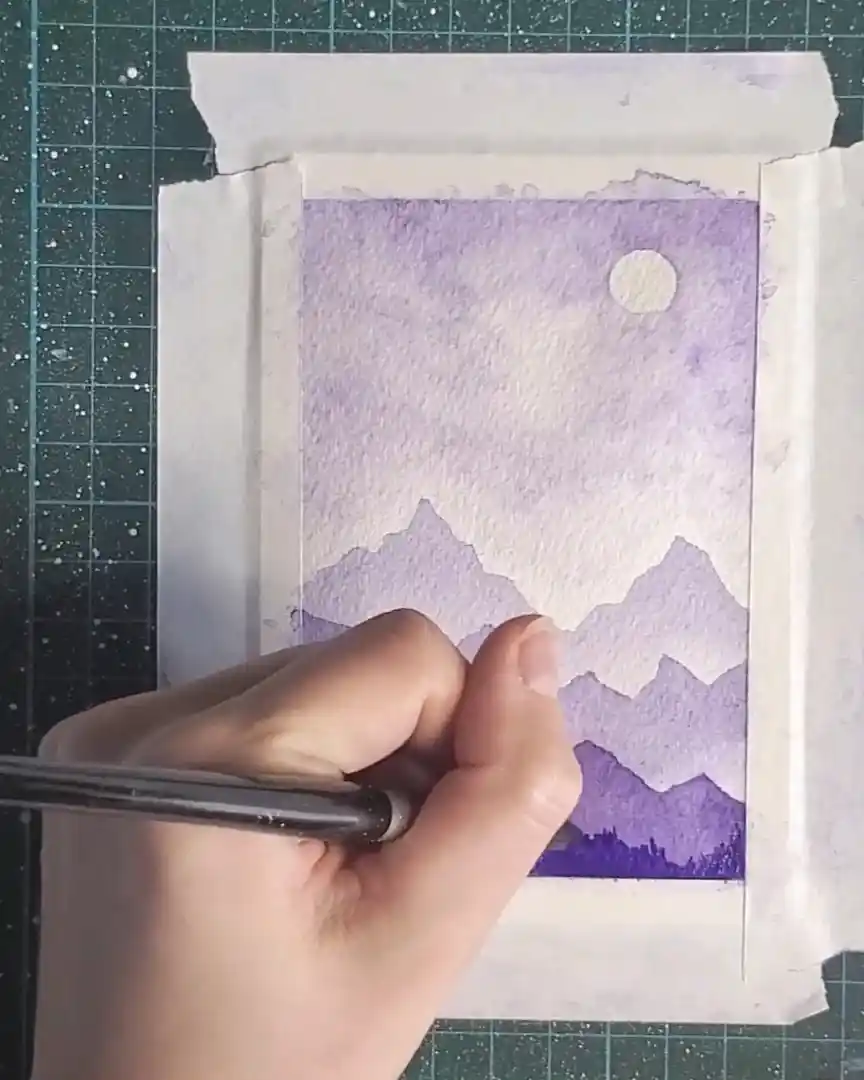 Once the shapes are filled, a clean, damp brush is used to softly blend the bottom edges, keeping the misty, atmospheric appearance.