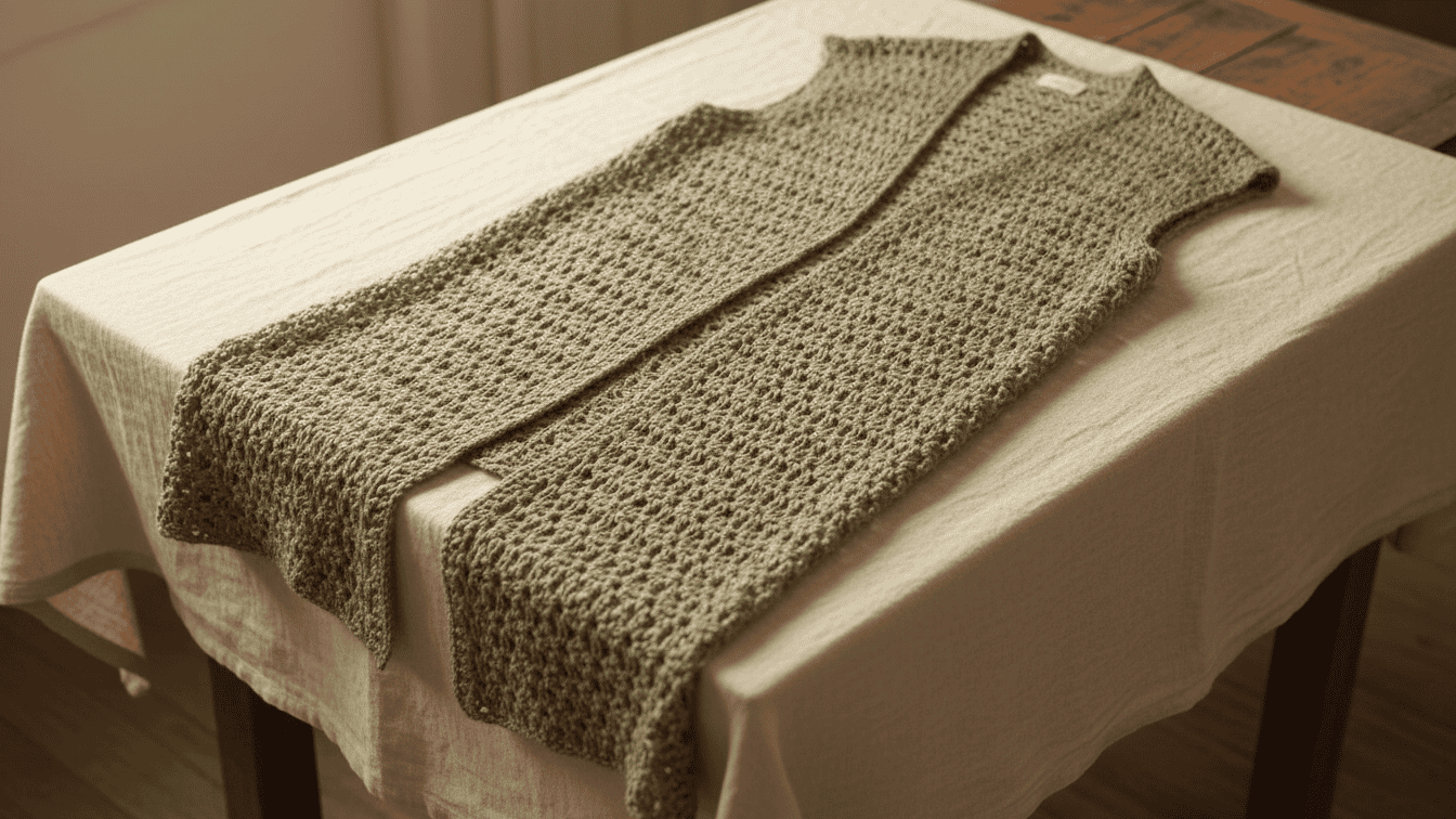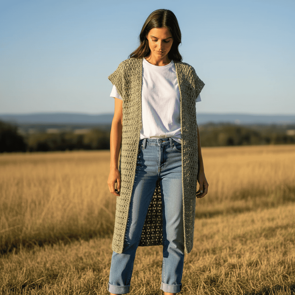This Free Refined Drape Crochet Cardigan Pattern features a long, graceful silhouette with an airy texture that drapes beautifully.