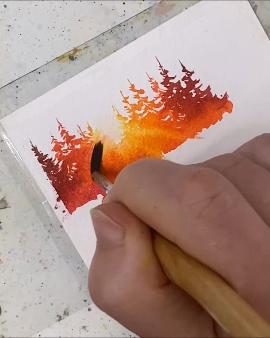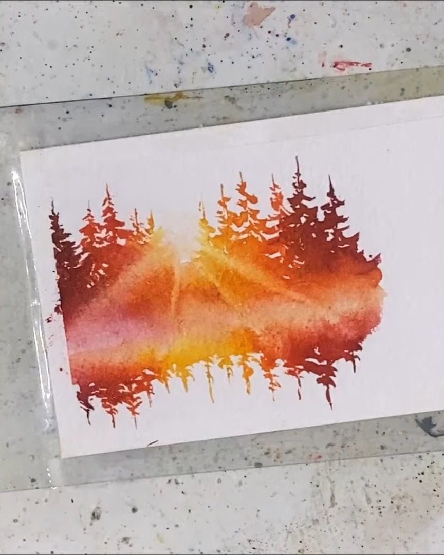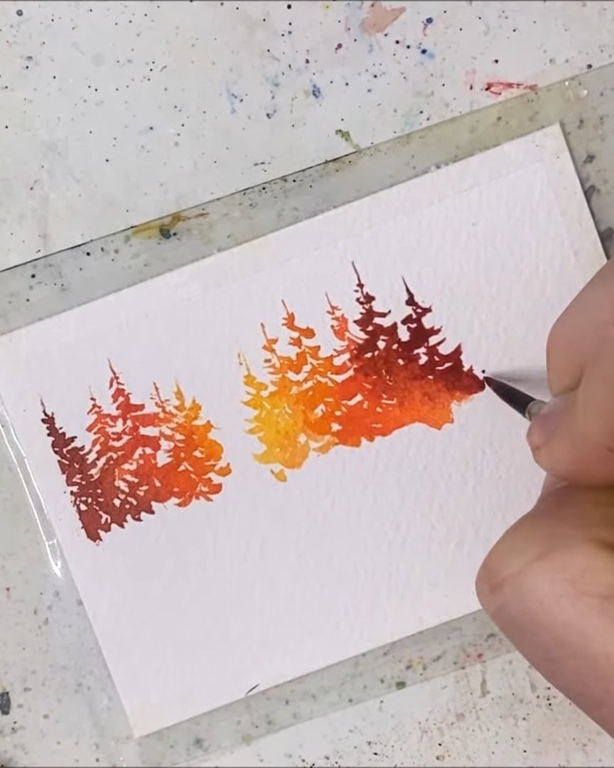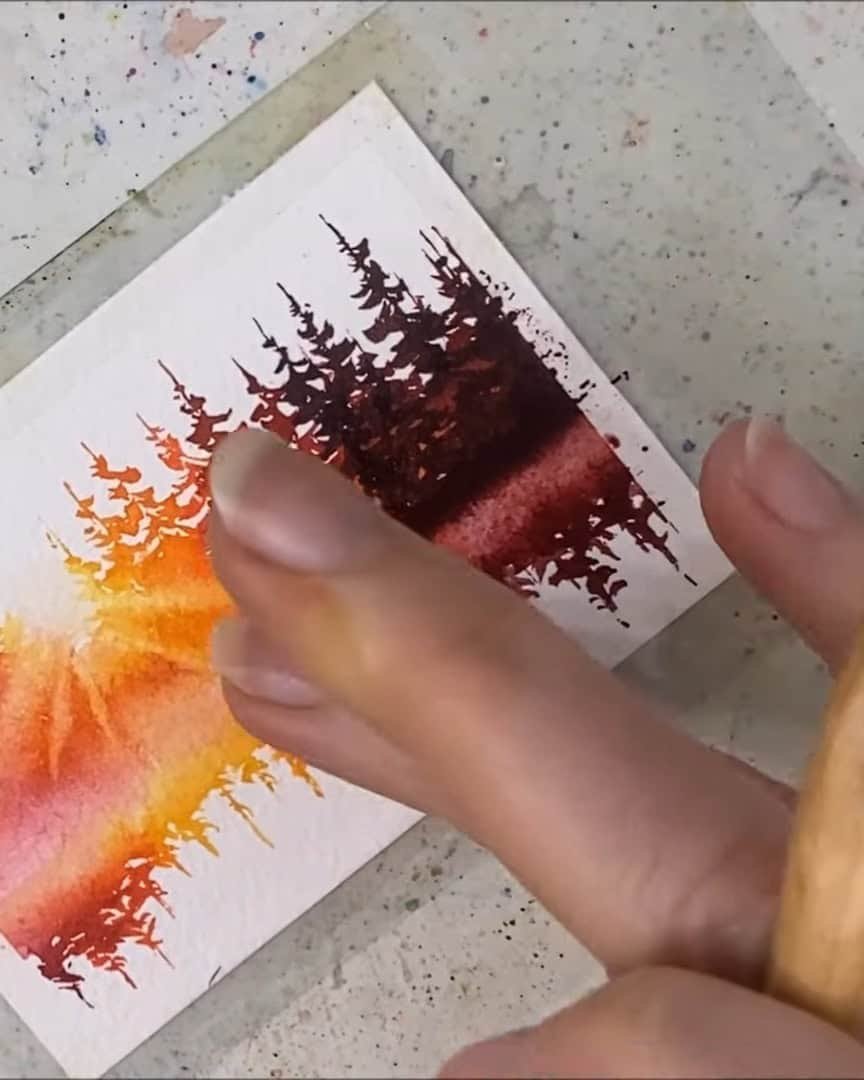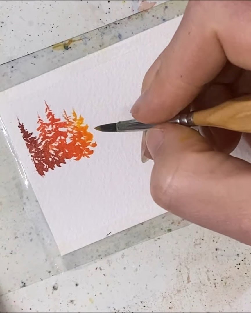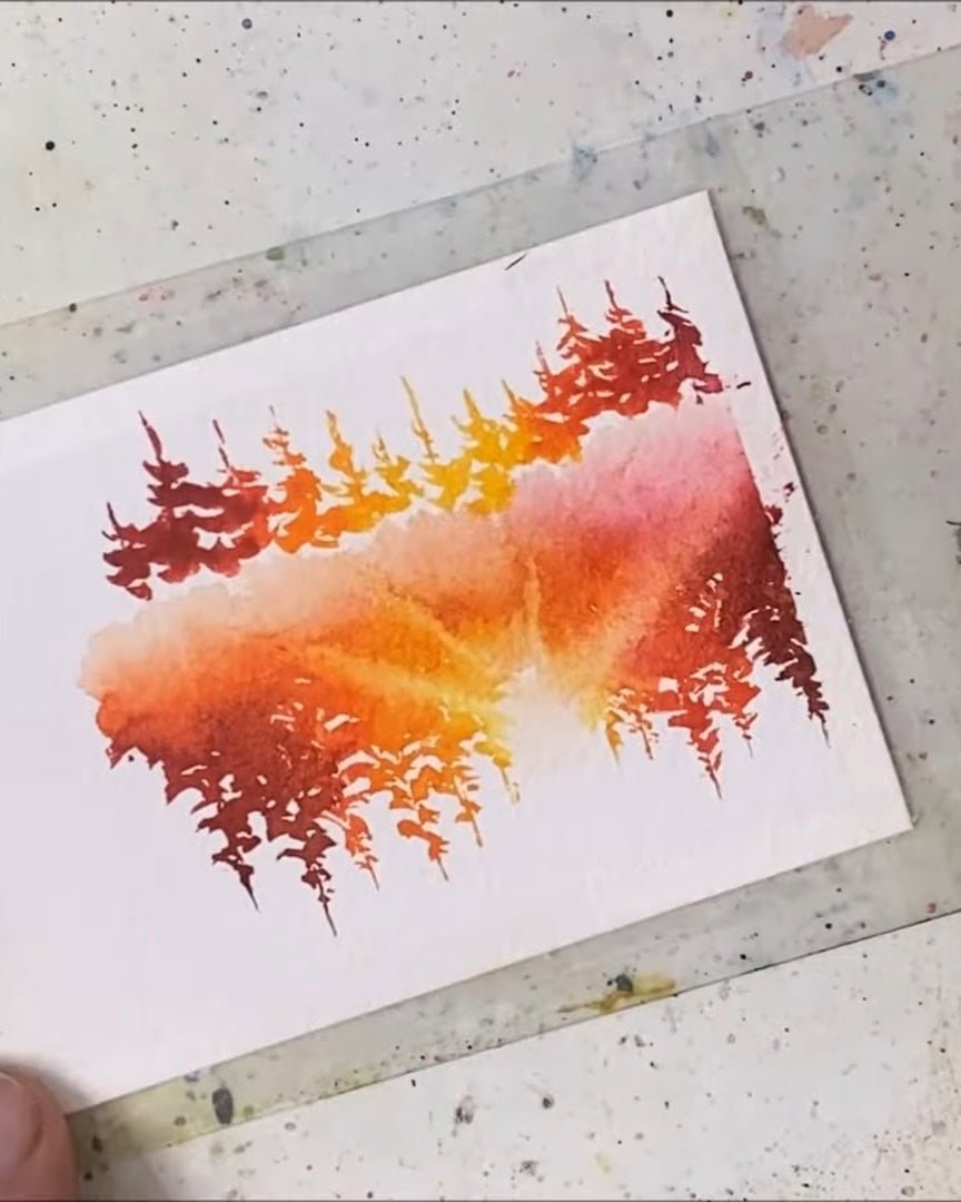 A small gap is left, the trees are added, and then the paper is quickly flipped to paint their reflections.