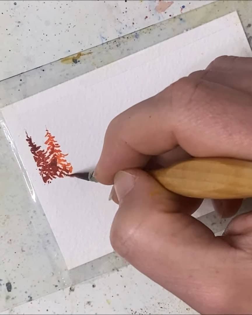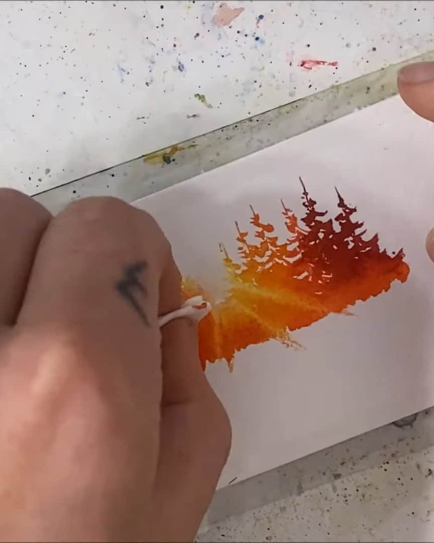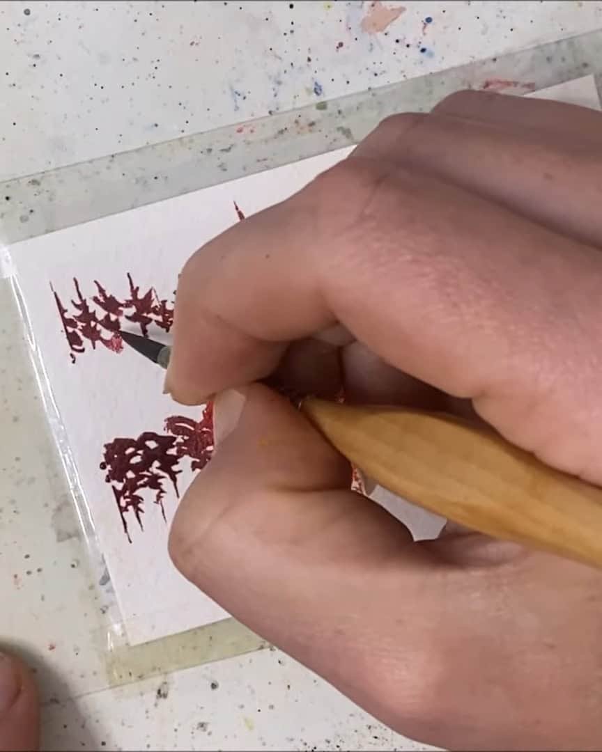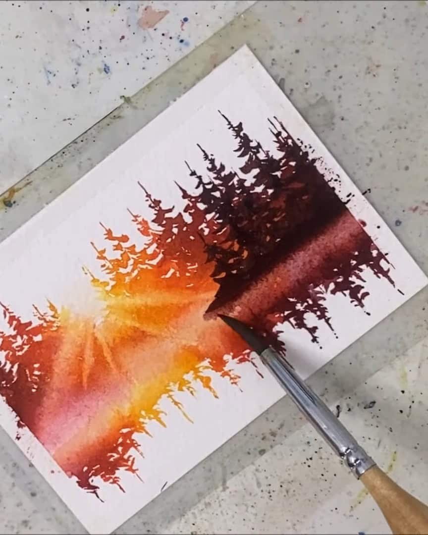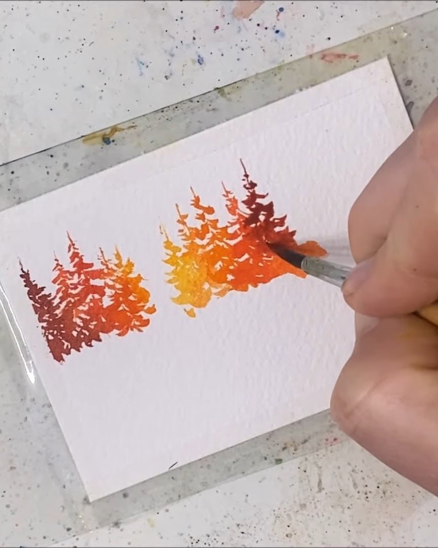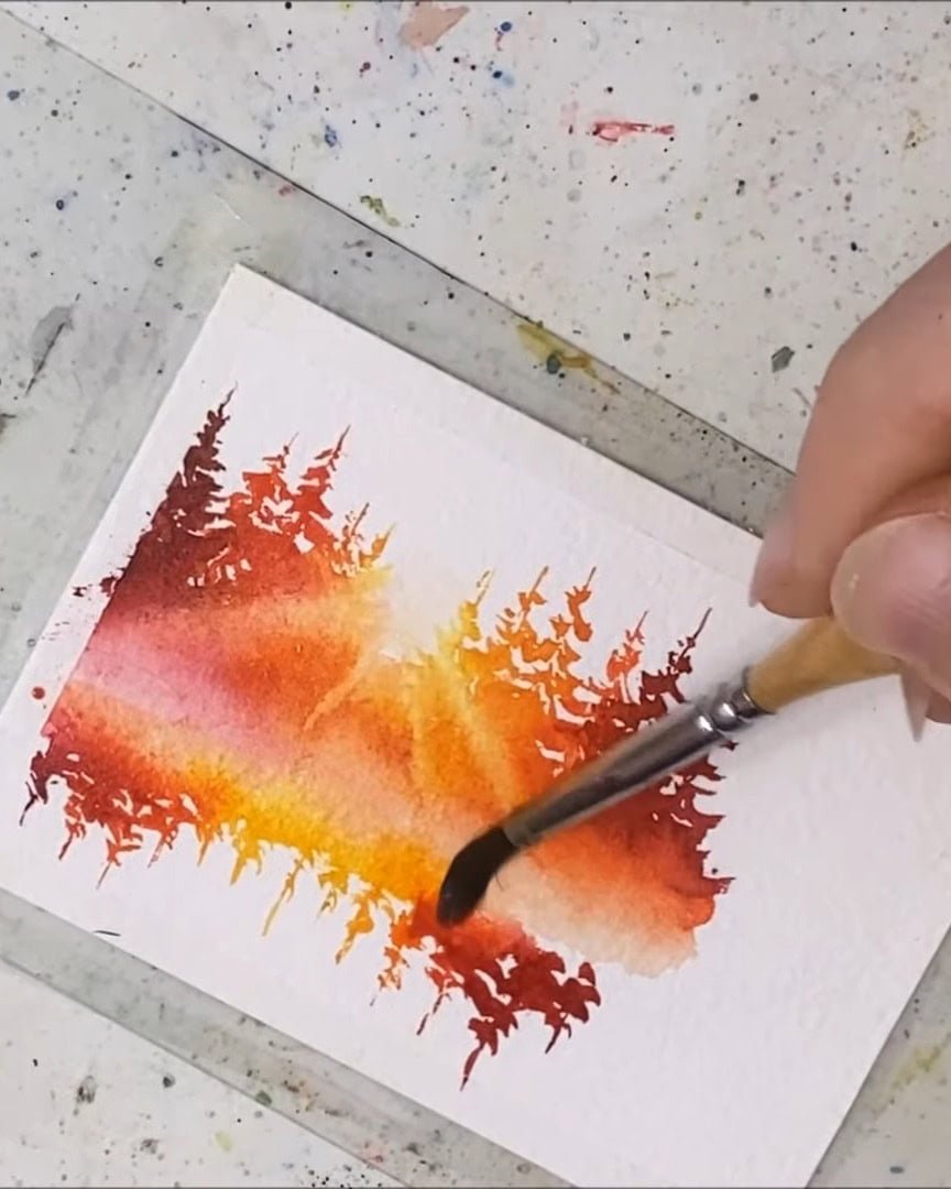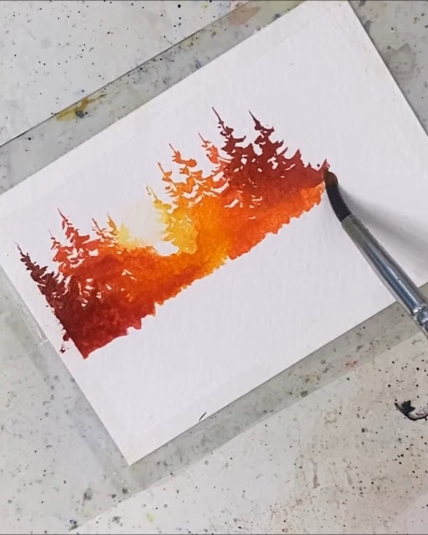 A small gap is left, the trees are added, and then the paper is quickly flipped to paint their reflections.