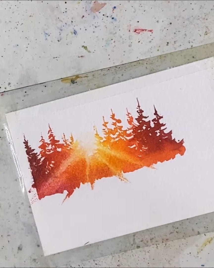 Since there’s a big sun beaming through the middle, the trees on the edges need to be darker. The artist begins with: