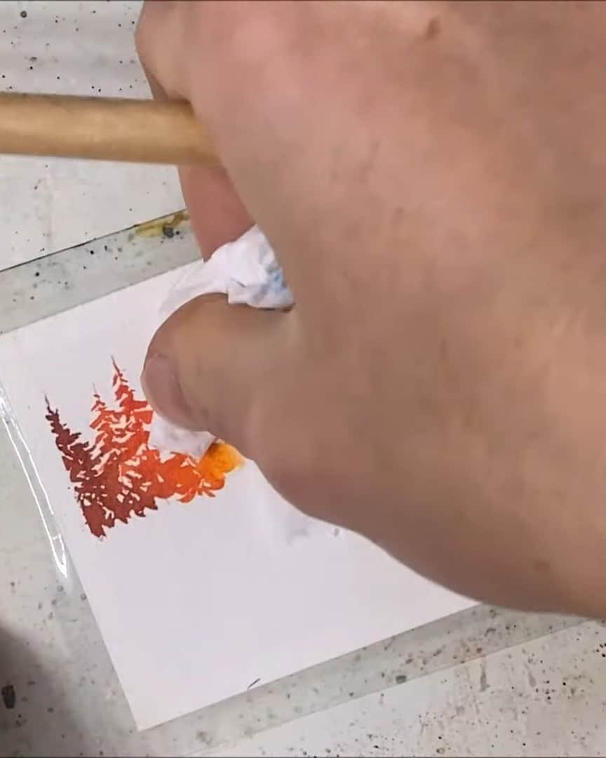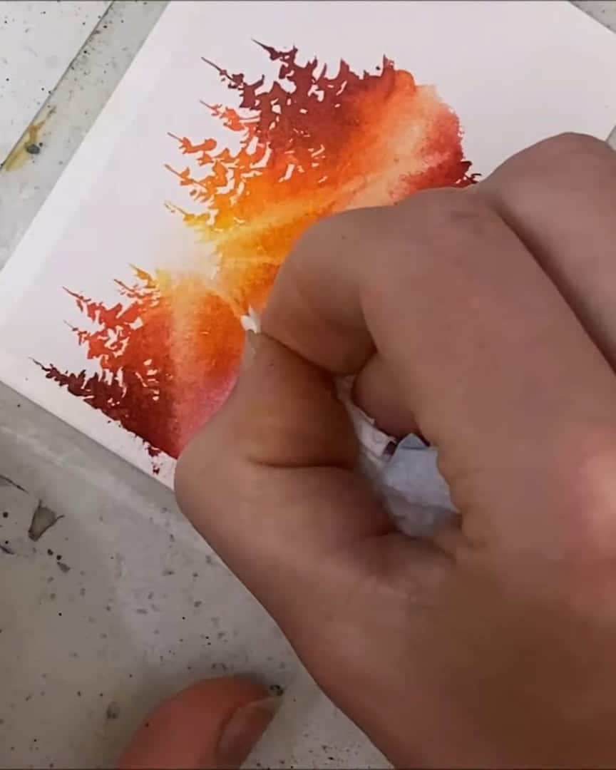 The artist also uses a paper towel again to lift some paint and create bright spots for the sun’s rays. This method works much better than expected!