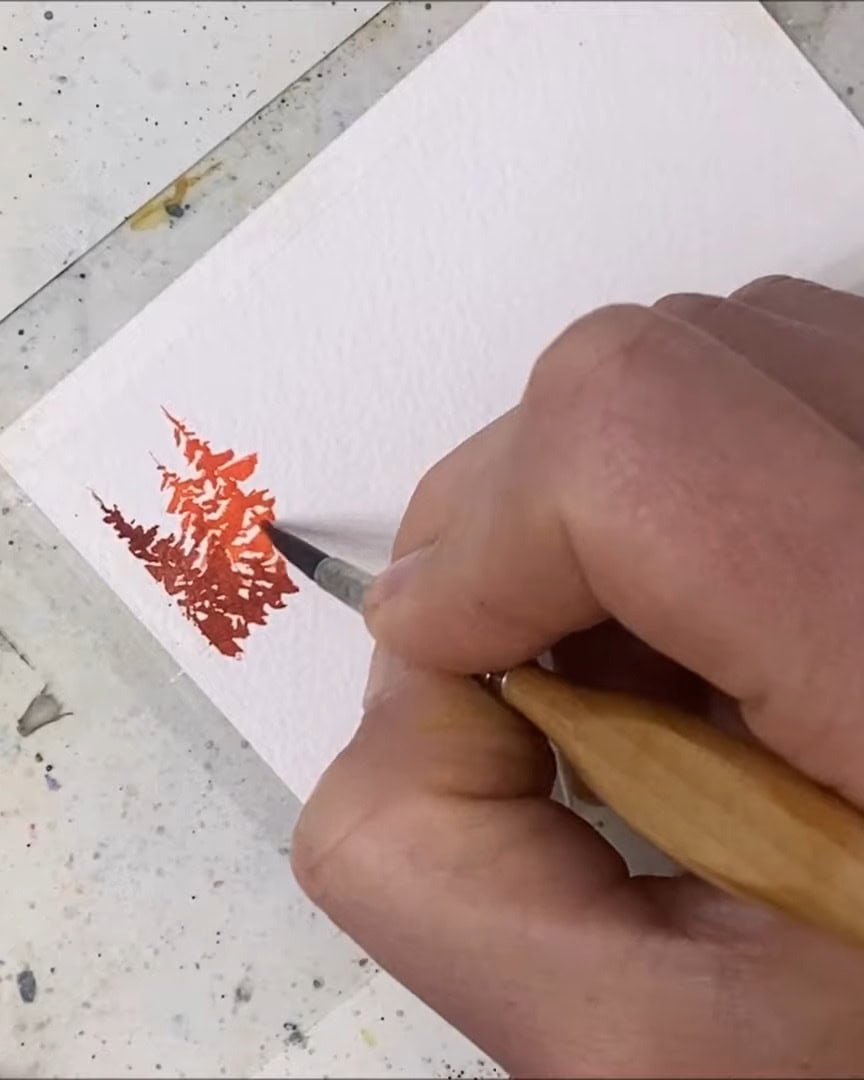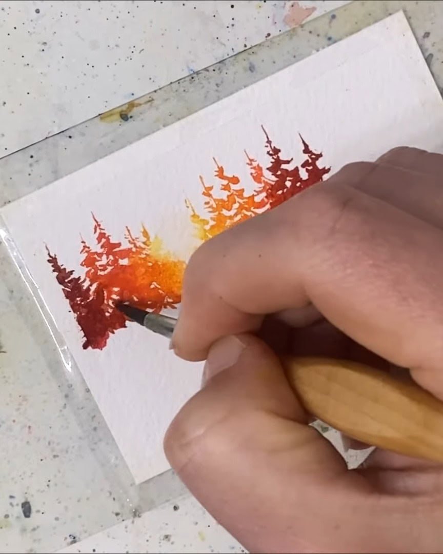Next, the artist goes over the trees lightly again since they’ve dried.