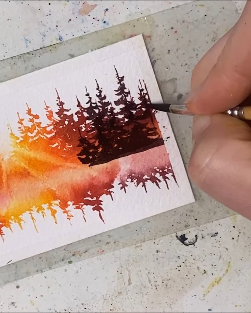 Now that the colors and layout are ready, it’s time to paint the tree silhouettes. The artist is working just from the picture, so if this doesn’t turn out well, maybe checking out Debbie Reeve’s tutorial would offer a more efficient technique. But the artist will give it their best shot!
