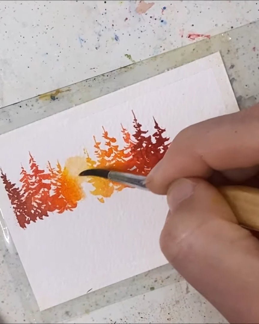 Now that the tree silhouettes are in place, it’s time to add the glowing sunbeam. This step moves quickly because the paint is already drying, so the artist must work fast.