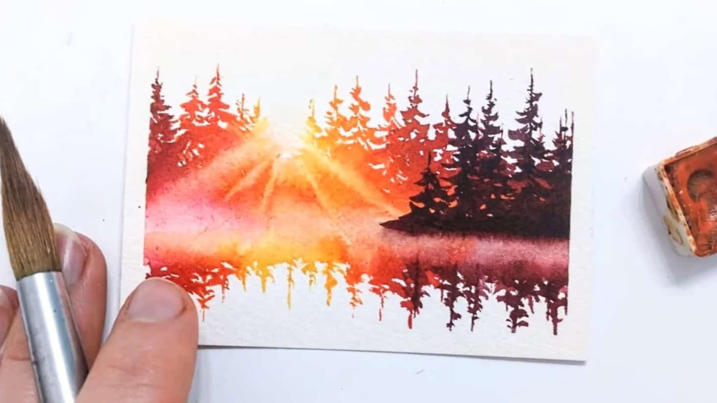 Painting sunbeams through pine trees over a calm lake may look complex, but with simple steps, it becomes an enjoyable process.