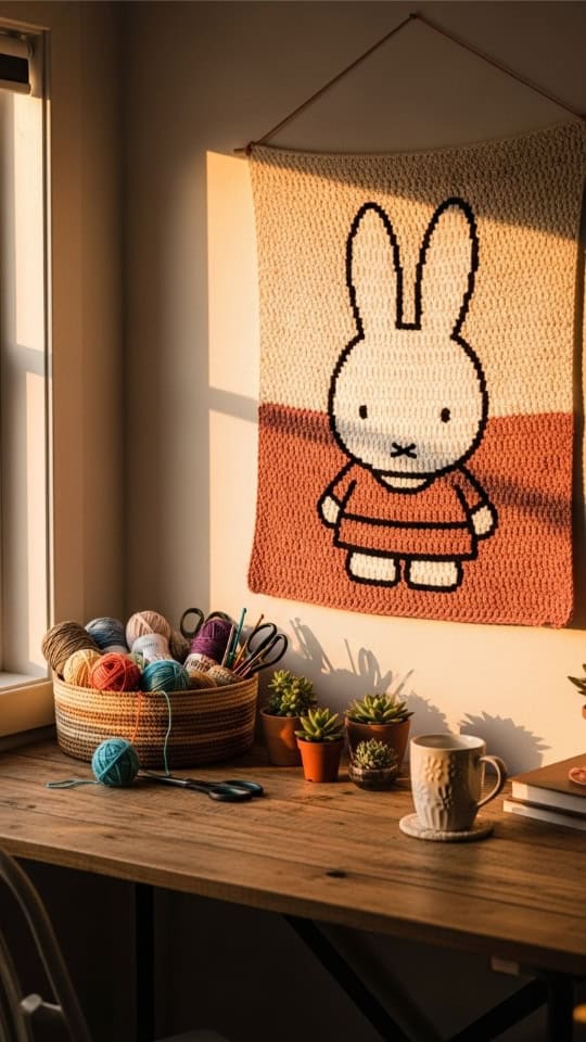 Miffy’s shape is easy to crochet, even for beginners. Soft pastel yarns work best to keep its gentle vibe. It’s small enough for pillows or wall hangings but still makes an impact in any space!