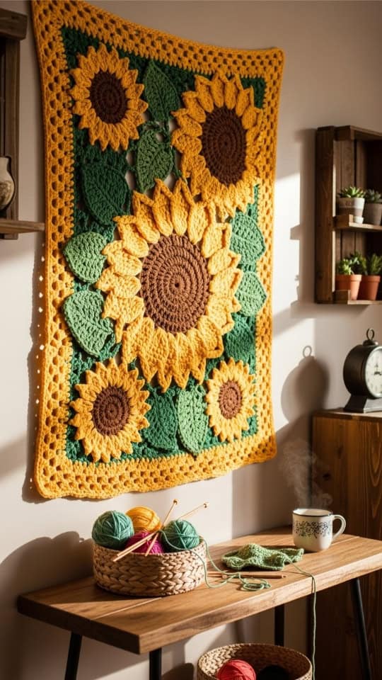 The texture of the yarn brings the sun to life. Each stitch glows like sunlight on a summer day. This piece makes rooms feel cheerful and cozy.
