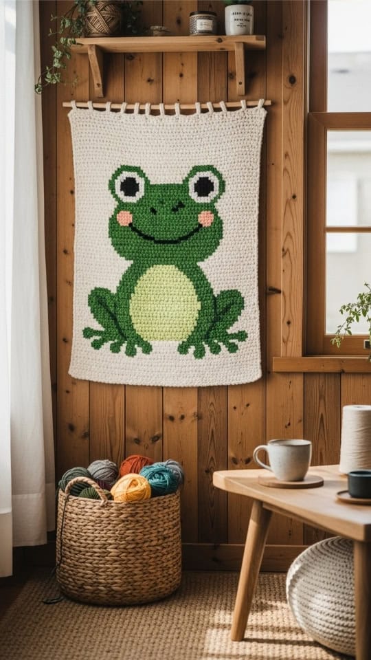 I love how frog tapestry crochet can bring life to a space. Over 1,000 frog-themed items on Etsy caught my eye, like a rug featuring a frog in a straw hat.