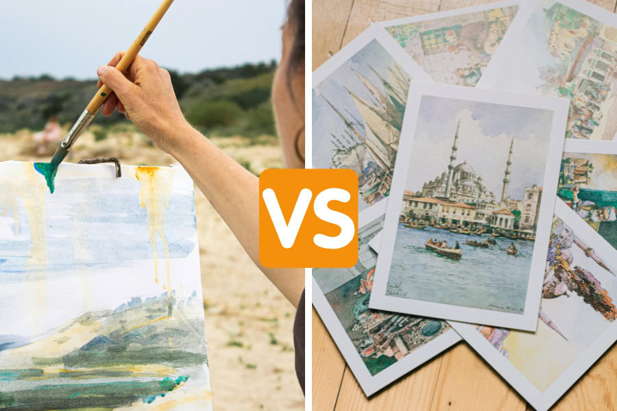 Watercolor originals and prints have clear differences. Originals often show unique textures and absorb more paint, while prints can look smooth and flat.