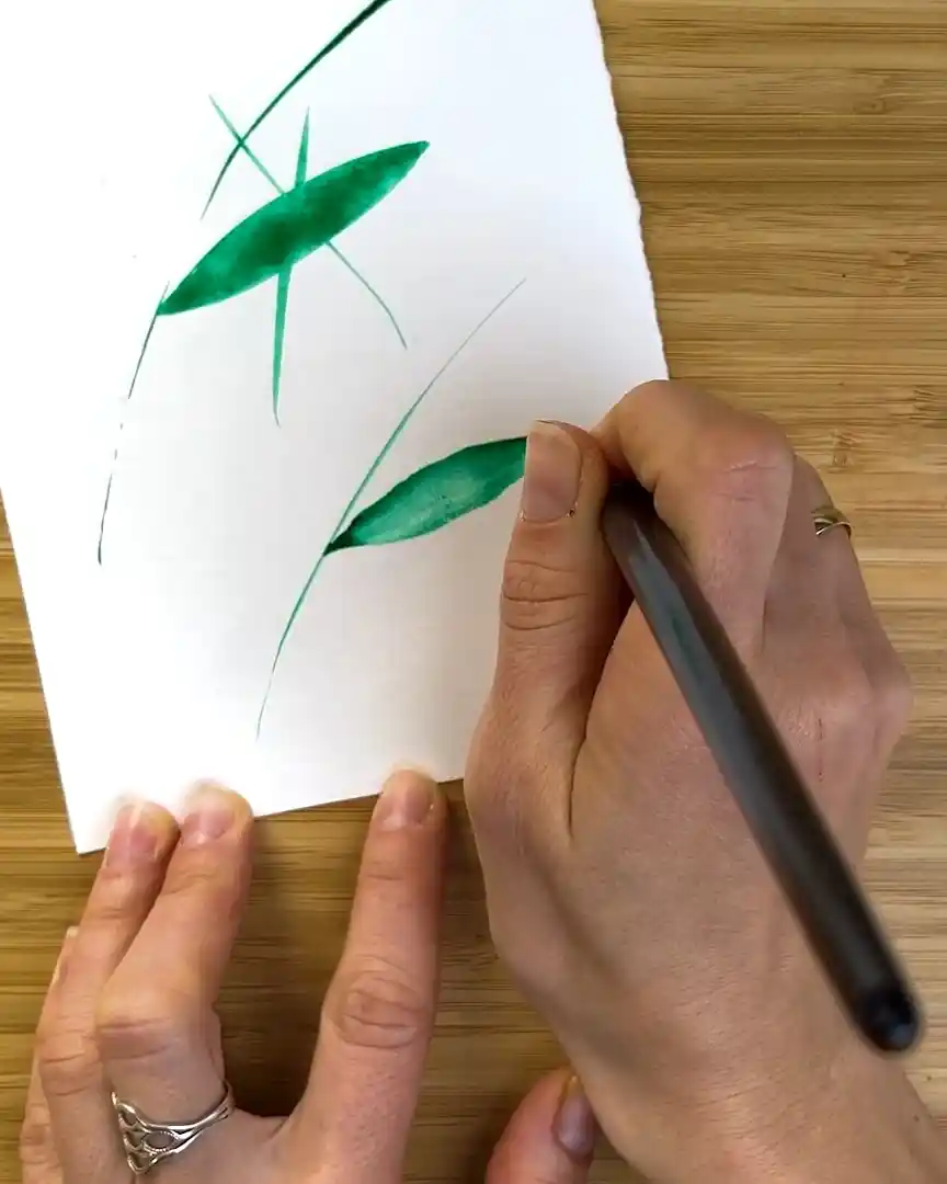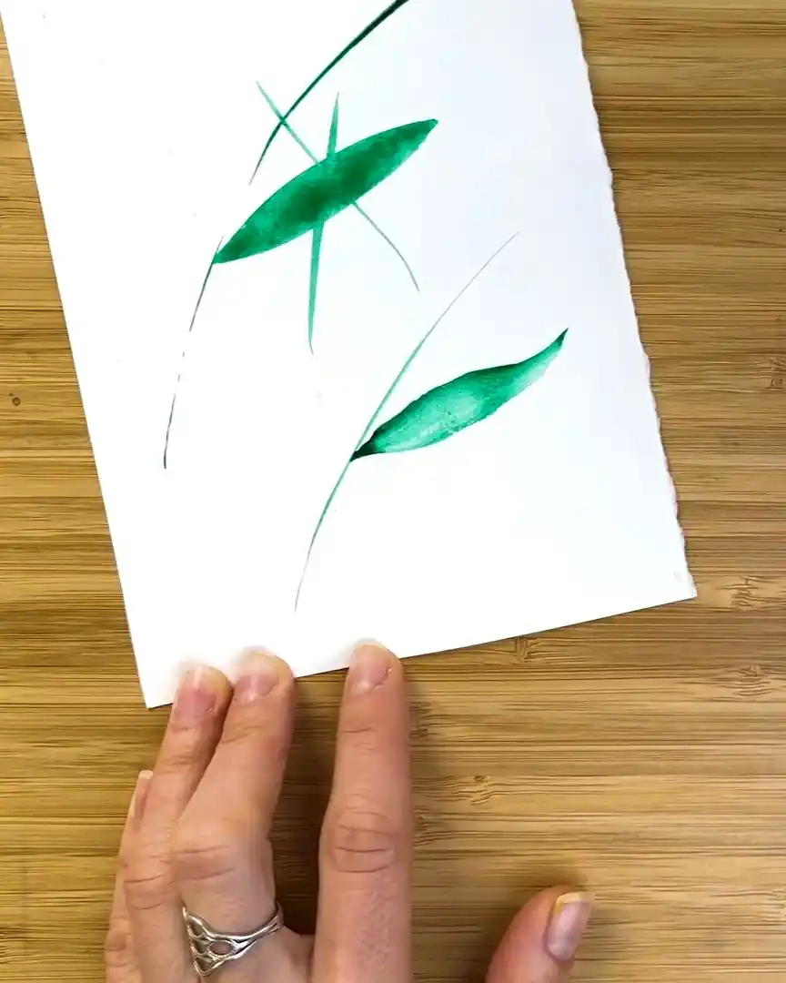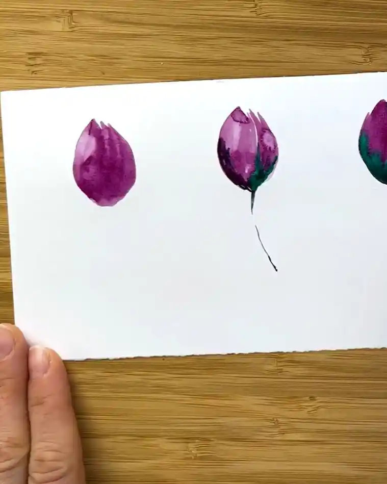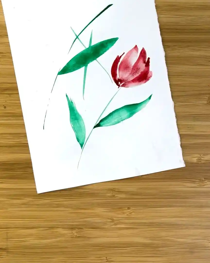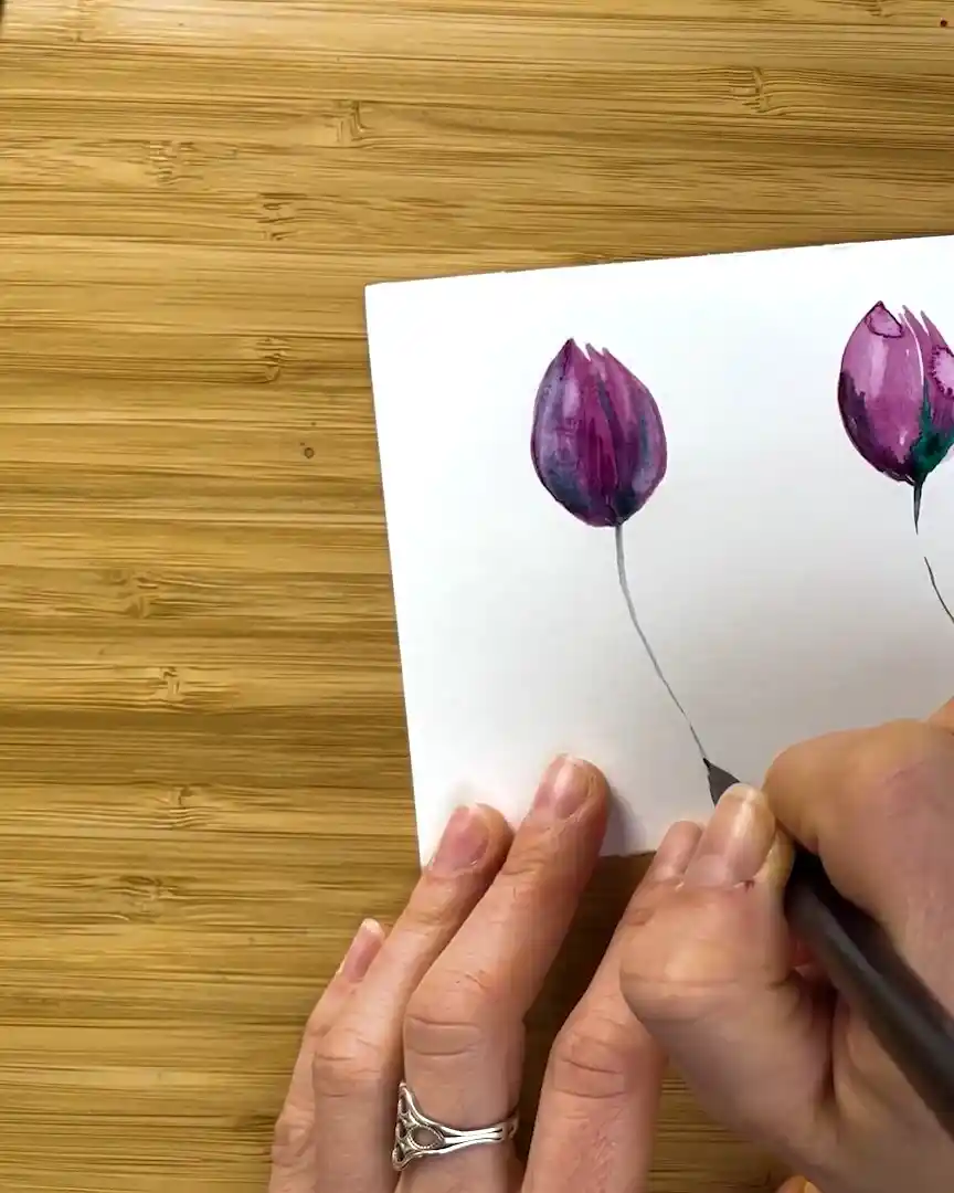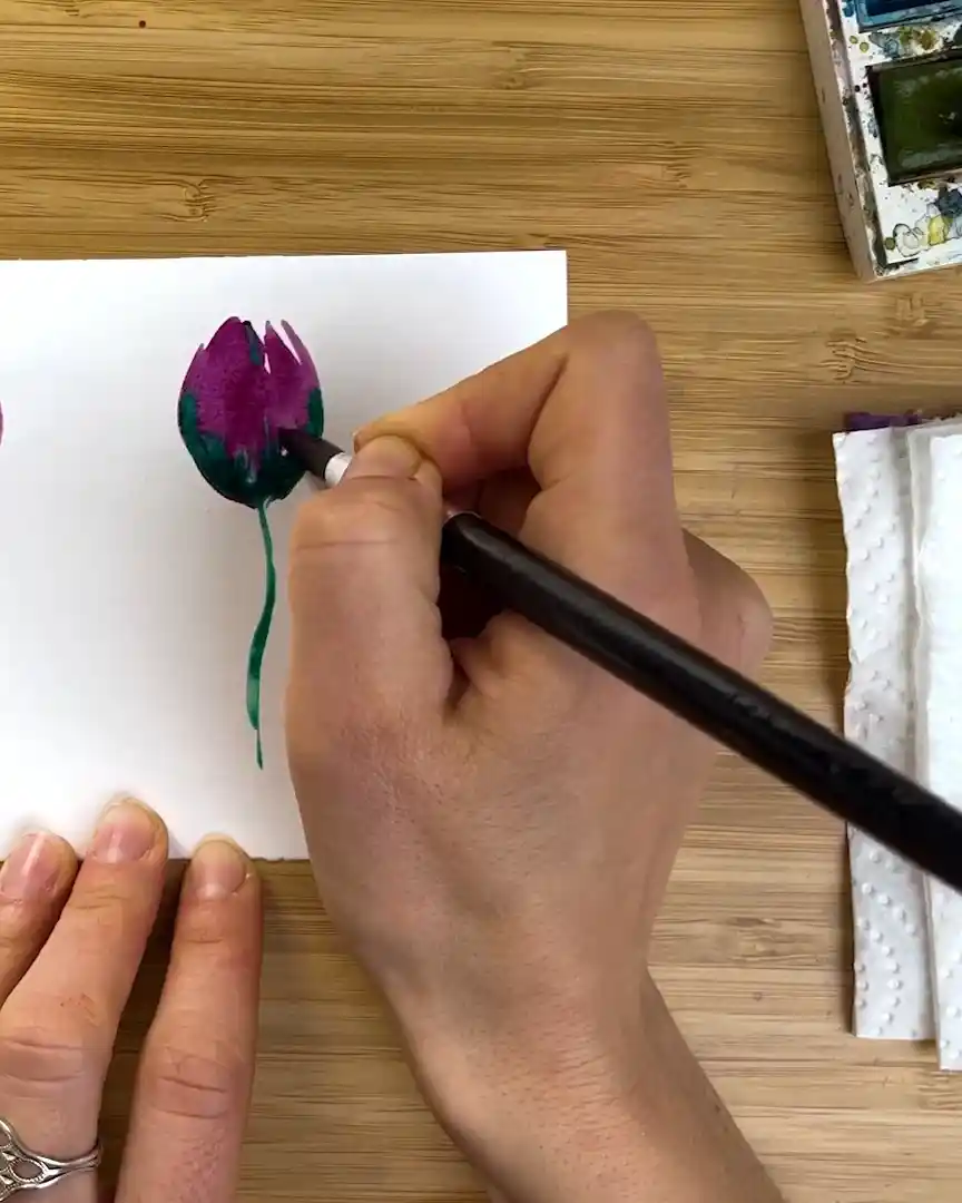 The artist’s third tip: when painting layers, work fast while the paper is wet or wait until everything is dry. Never add anything in between. Why? The artist will paint a tulip to explain the reason.