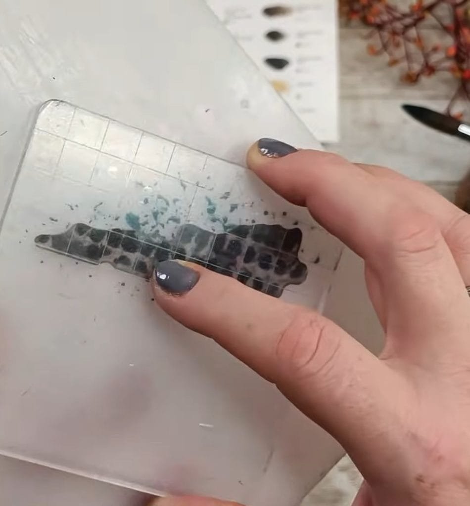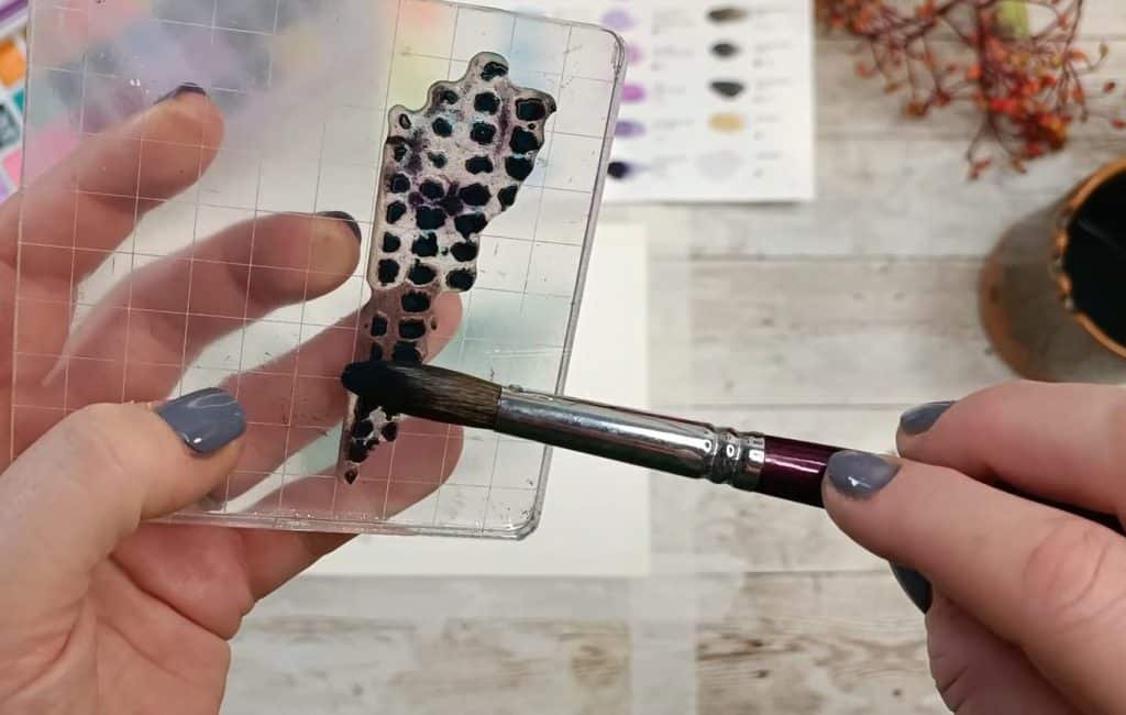 Too much water can wash out the paint, while too little may leave harsh marks. If there is excess water, she uses a paper towel to dab it away. In this way, you can keep the surface clean and ready for stamping.