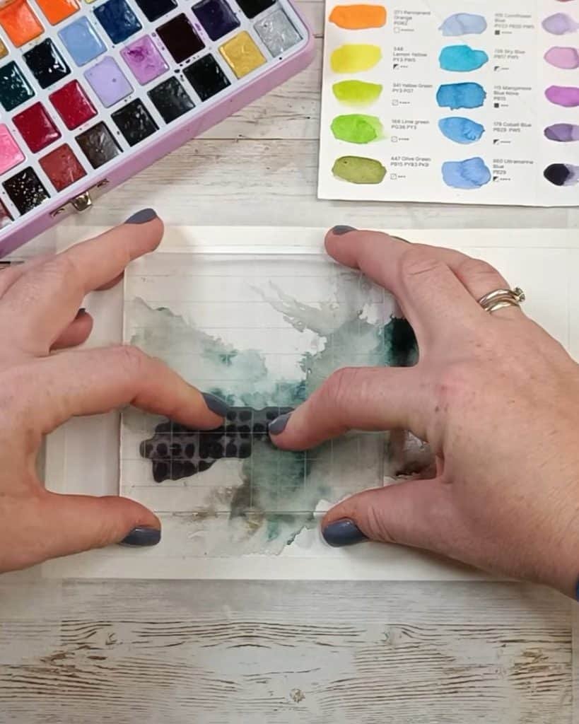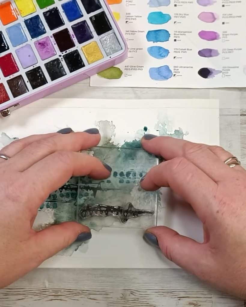 Now comes the core of the process: stamping with watercolors. Asia carefully explains each step so you can repeat it easily.