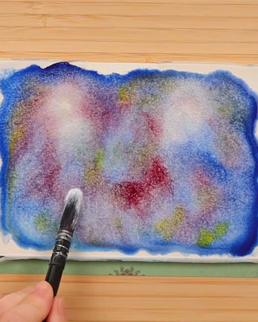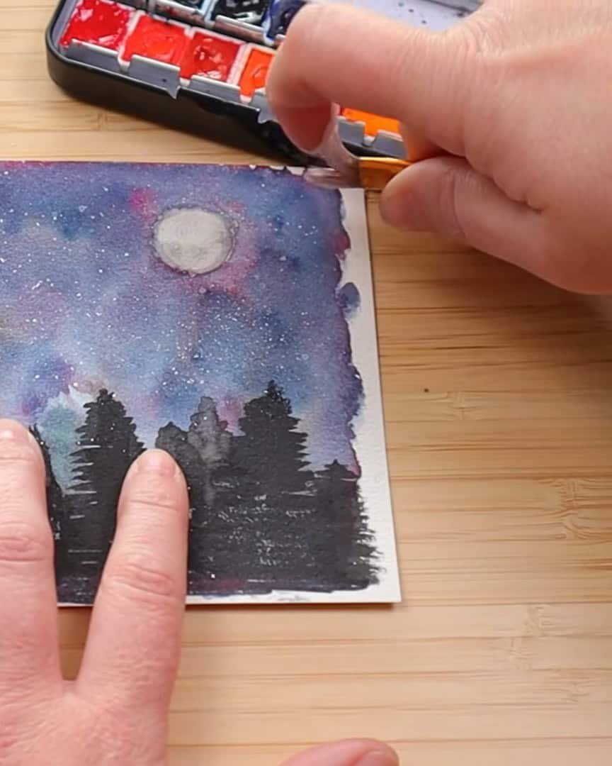 Now, here’s one of the artist’s favorite ways to use white watercolor paint—splattering. The artist always reaches for it when painting night skies.