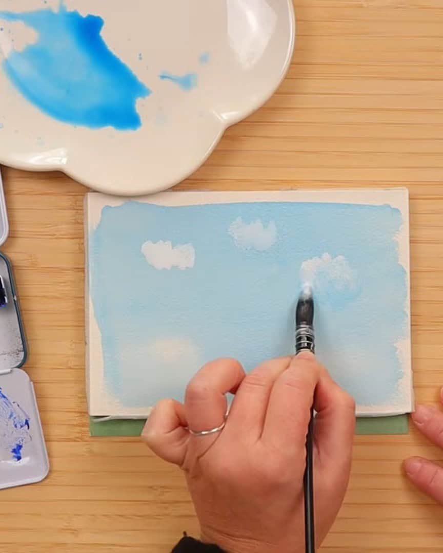 So instead, the artist lets the paint dry completely. Then the artist comes back in and gently adds a bit of white. It won’t look crisp white, but it gives that light, soft highlight or cloudy shape the artist is aiming for.