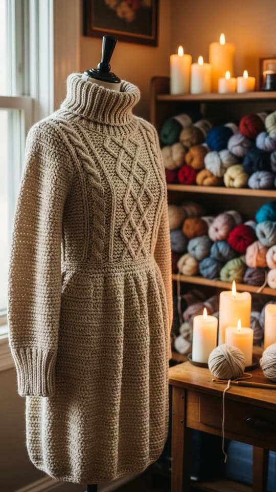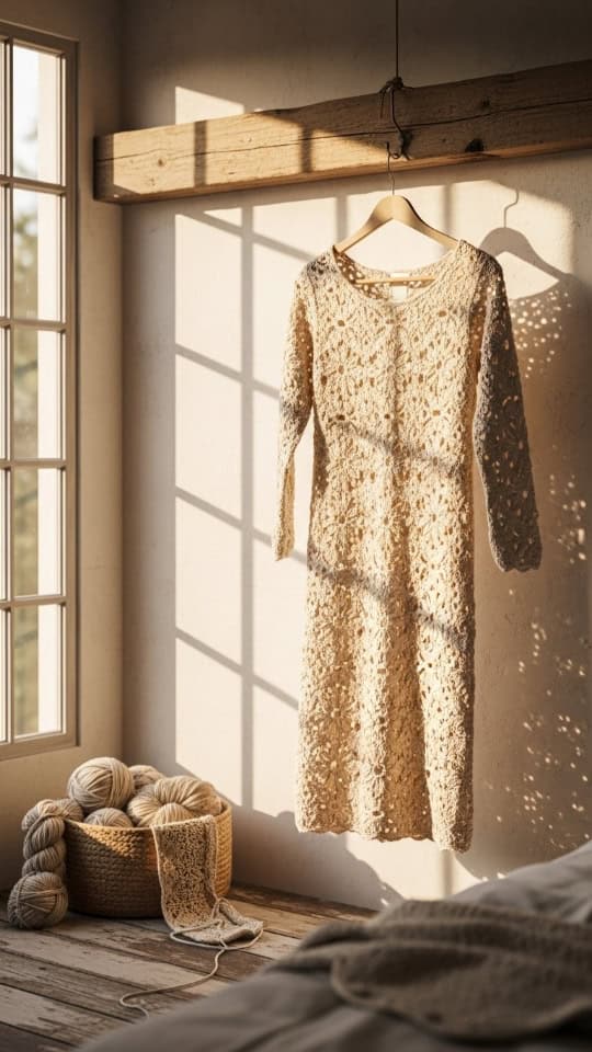 long-sleeve crochet dress adds both style and warmth to winter evenings. Thick yarn creates a cozy fabric, perfect for cold weather.