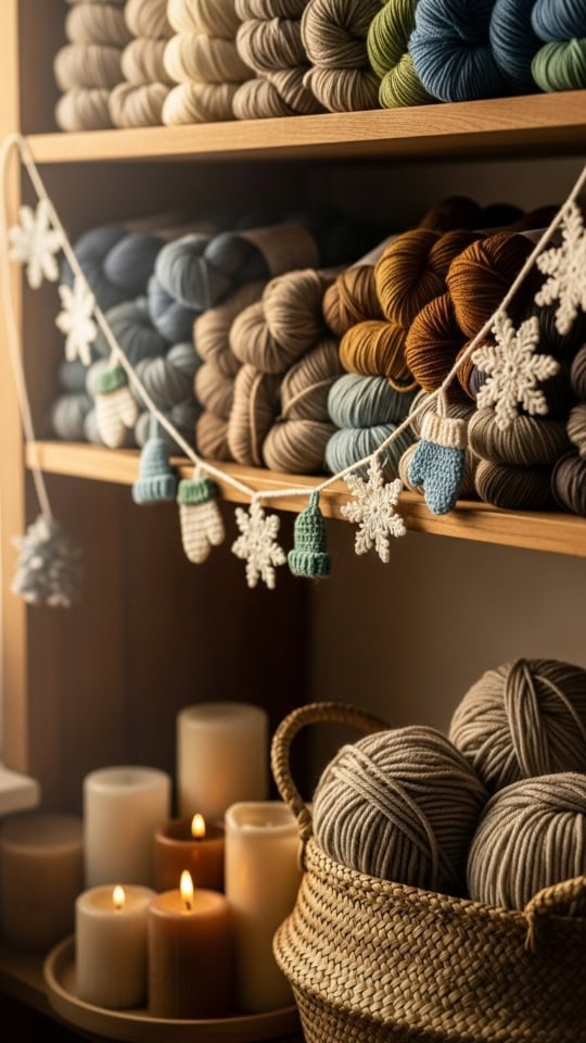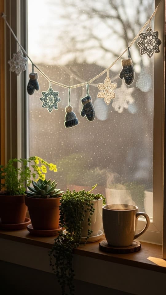 A cozy dress leads to festive decor. I love making crochet garlands for winter. Snowflakes and mittens look so cheerful on windows!