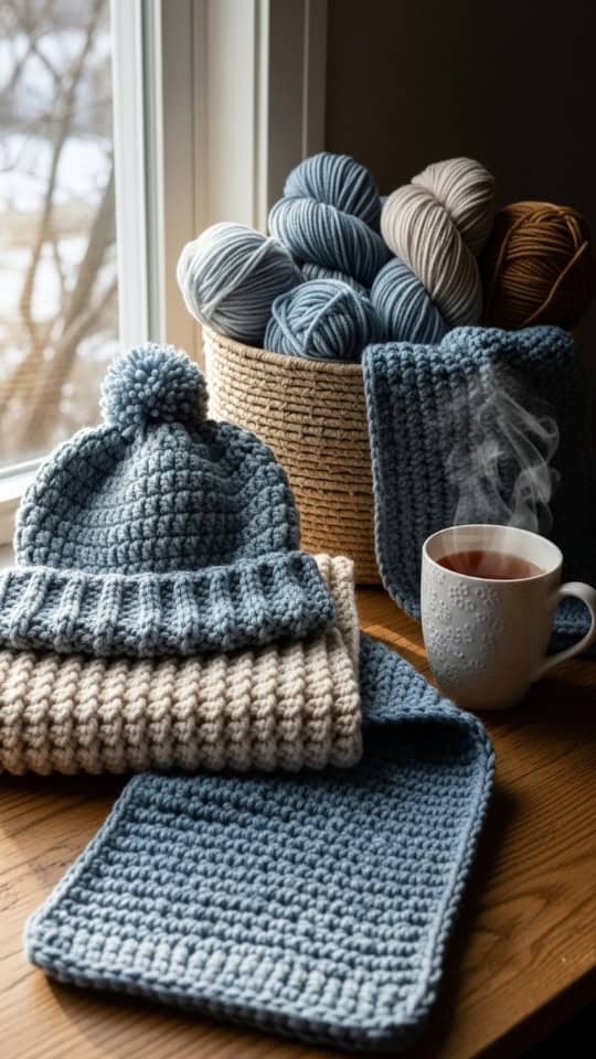 Winter crochet patterns include cozy scarves, warm hats, chunky blankets, and festive handmade gifts like mittens or ornaments.