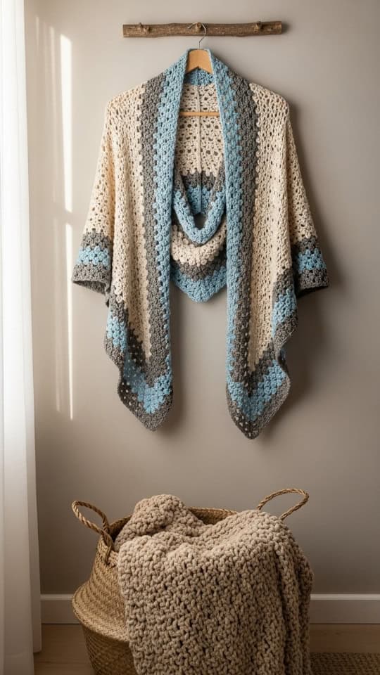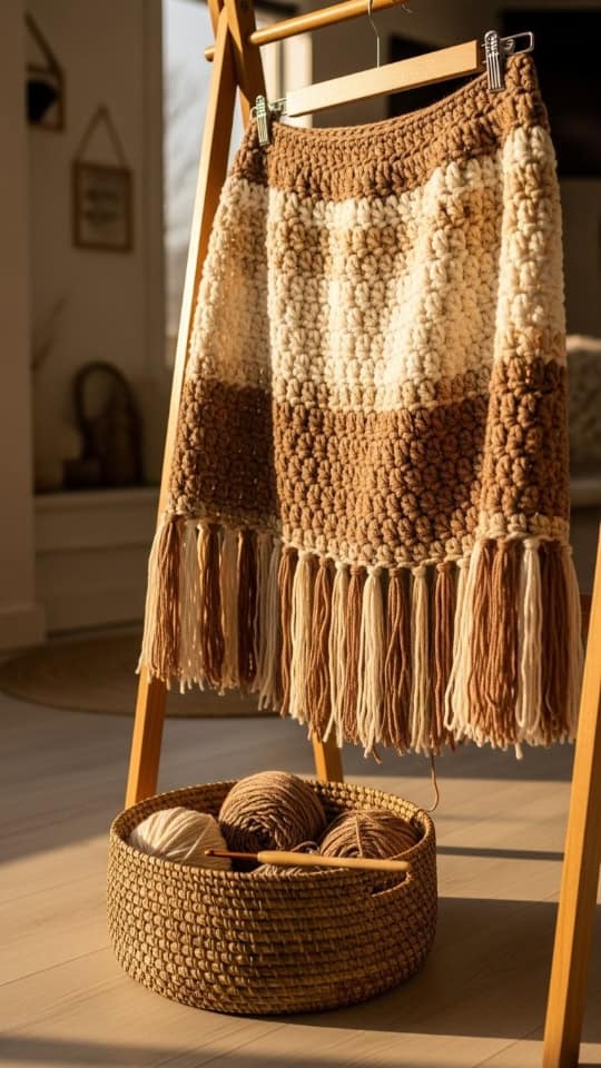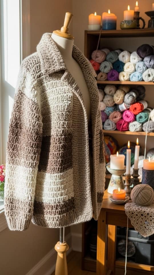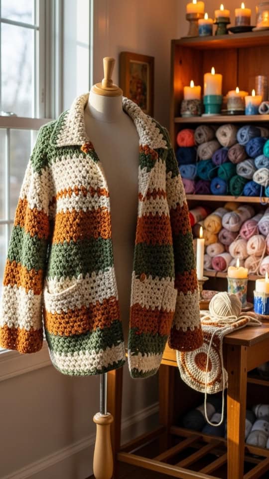 striped crochet jacket in earthy tones feels perfect for winter. I like how the rustic colors add charm to cold days. Thick yarn makes it cozy, and the stripes give it character.