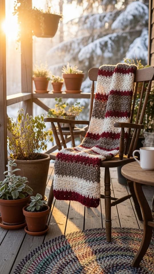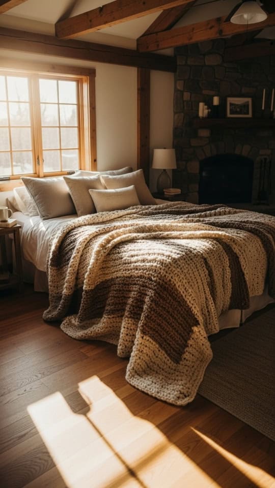 cozy striped crochet blanket feels perfect for winter nights. I love how the simple double crochet and granny-stripe stitches create texture.