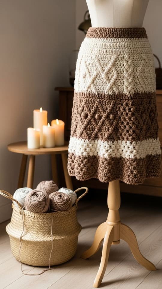 Two-tone crochet skirts bring style and warmth to winter outfits. I enjoy how these designs mix colors, like soft grays with blush pinks or earthy greens with creams, for cozy seasonal vibes.