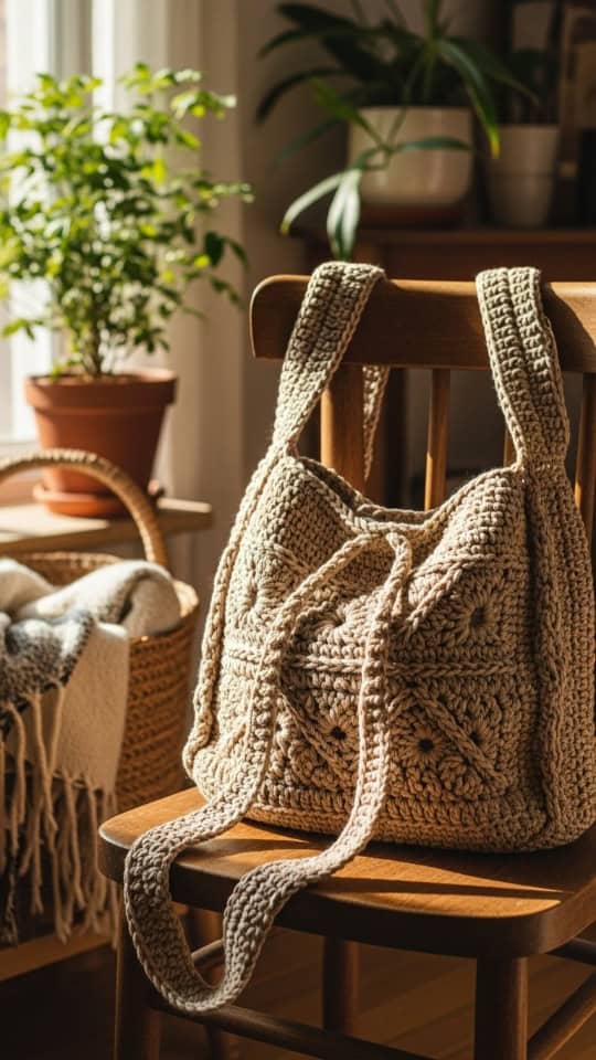 This crochet tote bag is both functional and stylish. It uses textured squares made with the Crunch Stitch. This stitch combines slip stitches and half double crochets, giving it a nice look and feel.